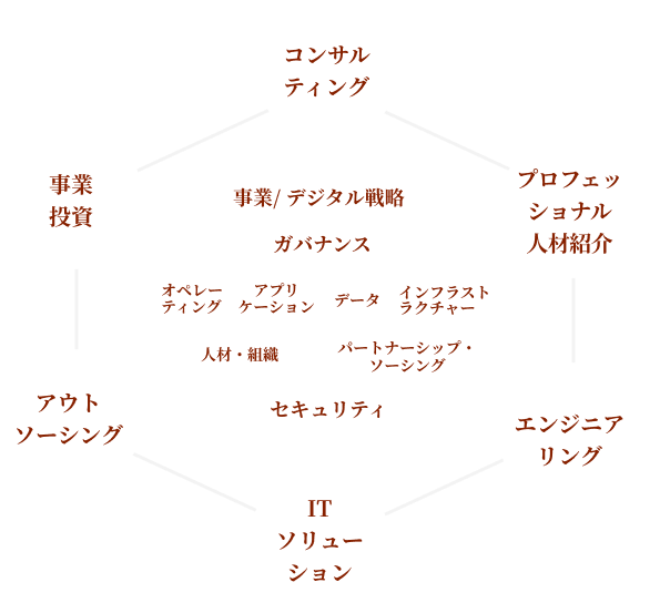 Digital Impactでは「枠にとらわれず、無限大の価値を創出する」ことをミッションに、コンサルティング、プロフェッショナル人材紹介、エンジニアリング、IT製品、アウトソーシング、事業投資のビジネスモデルでお客様の成長を実現しています。