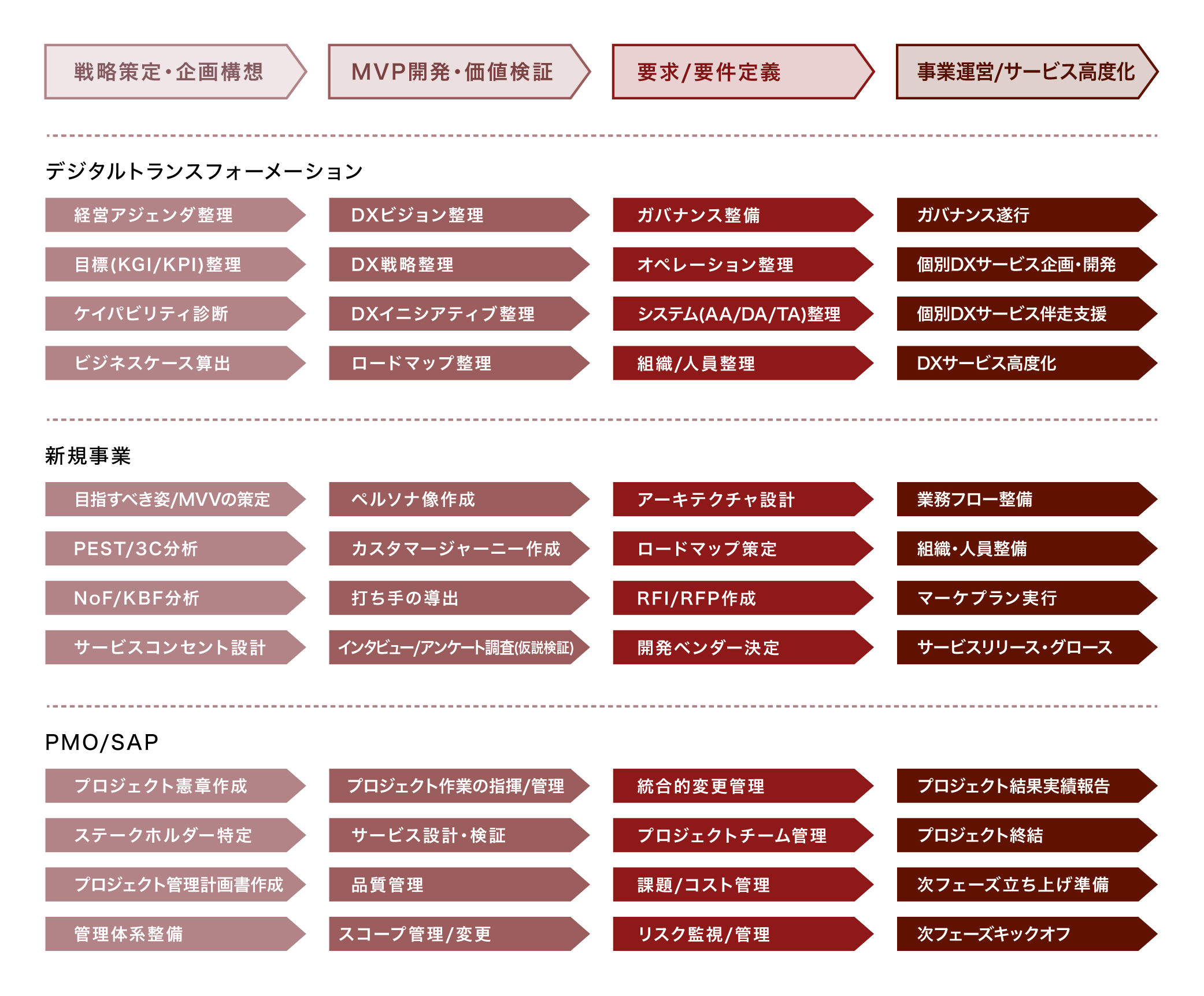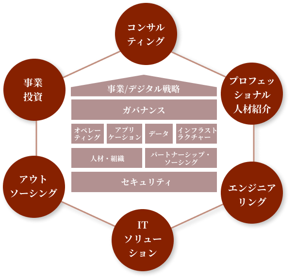 戦略策定・企画構想、MVP開発・価値検証、要求/要件定義・開発、事業運営/サービス高度化に至るまで一貫したコンサルティングサービスを提供して、成長支援を行います。世界各国において、デジタルトランスフォーメーション、新規事業、PMO/システム構築の領域を中心として、様々なコンサルティングサービスを手掛けております。デジタルトランスフォーメーションは、戦略、ガバナンス、オペレーション、ITアーキテクト、組織・人員、社風・文化などに至るまでデジタルカンパニーへの変革をご支援いたします。新規事業は、ビジネス・サービス・システムが三位一体となって事業の構想策定を行い、顧客受容性・収益性・実現性などの観点を抑えながら事業立ち上げ・運営をご支援いたします。PMO/システム構築は、プロジェクト管理のフレームワークを基に、システムケイパビリティあるコンサルタントがアクティビティPMOとして推進することで、プロジェクトの成功に向けてご支援いたします。